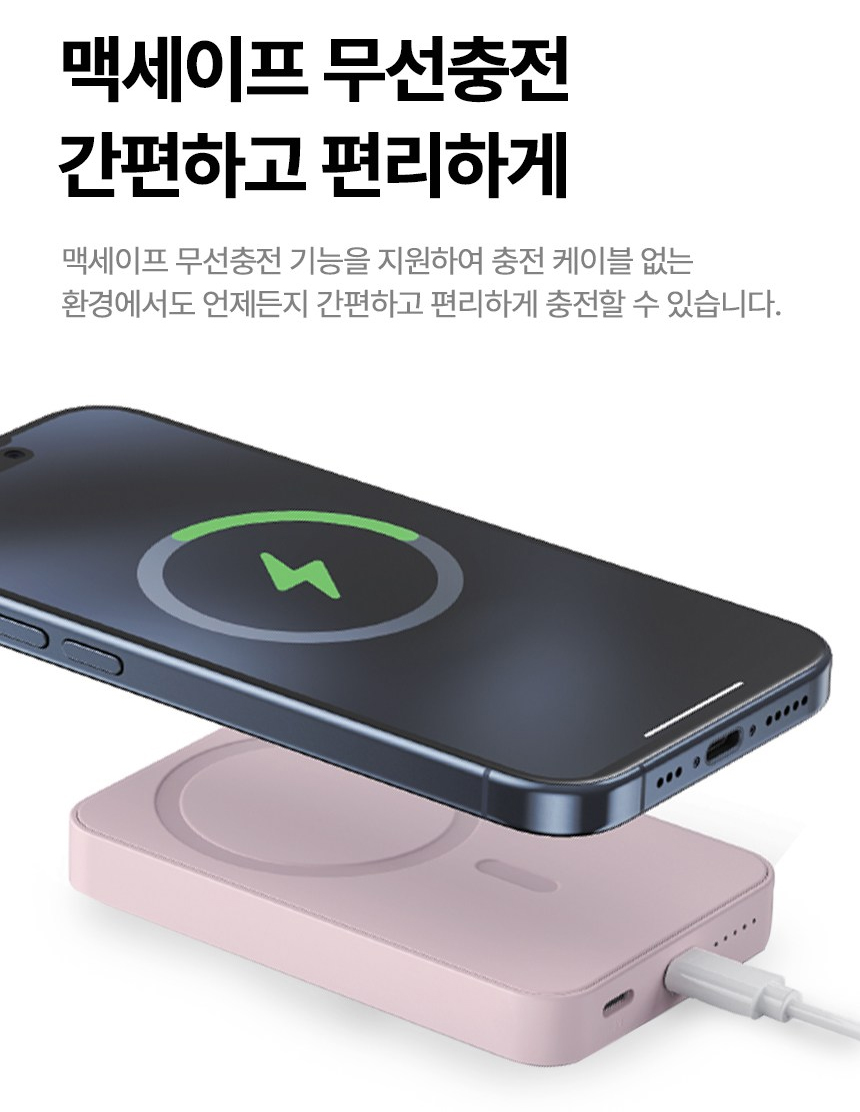 이 기기 오천 밀리암페어시 용량 갖추고 있으며 무선 방식 전력 공급 가능합니다. 자석 활용한 맥세이프 기술 적용되어 스마트폰 뒷면 견고하게 달라붙습니다. 유에스비 피디 규격 지원하여 유선 연결 시 빠른 속도 보여주며 충전 잔량 표시 기능 탑재되어 남은 양 파악 쉽습니다.