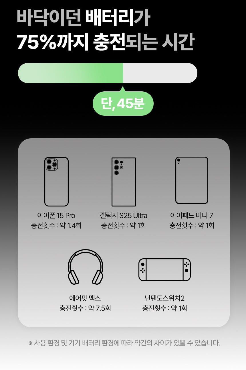 하단 씨 타입 단자 통해 본체 채우거나 다른 장치 전력 공급합니다. 유에스비 피디 기술 덕분 여러 외부 기기 호환성 우수하며 범용성 넓습니다. 두 개 포트 동시 사용하면 무선 포함 여러 기기 함께 채우기 가능했습니다.